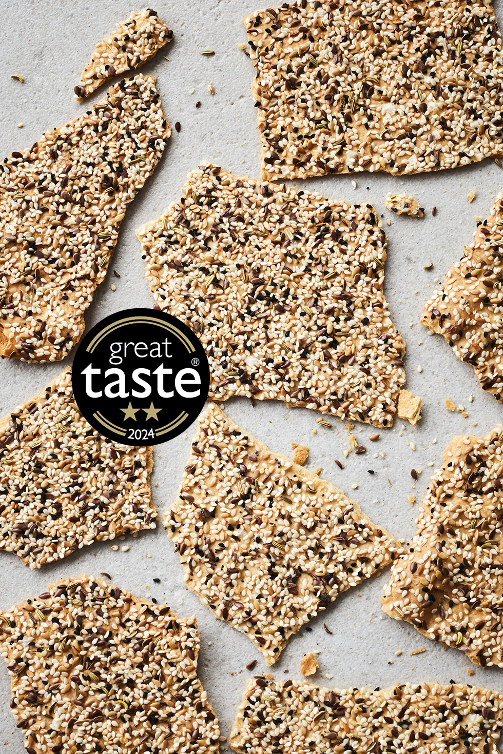 Fragrant, buttermilk crackers scattered with sea salt and seven seeds: sesame, yellow and brown linseeds, fennel, poppy, caraway and nigella.